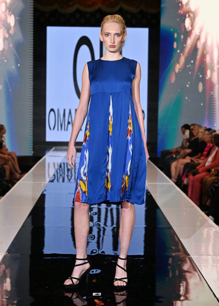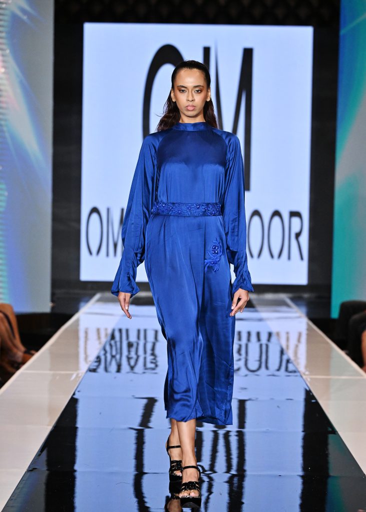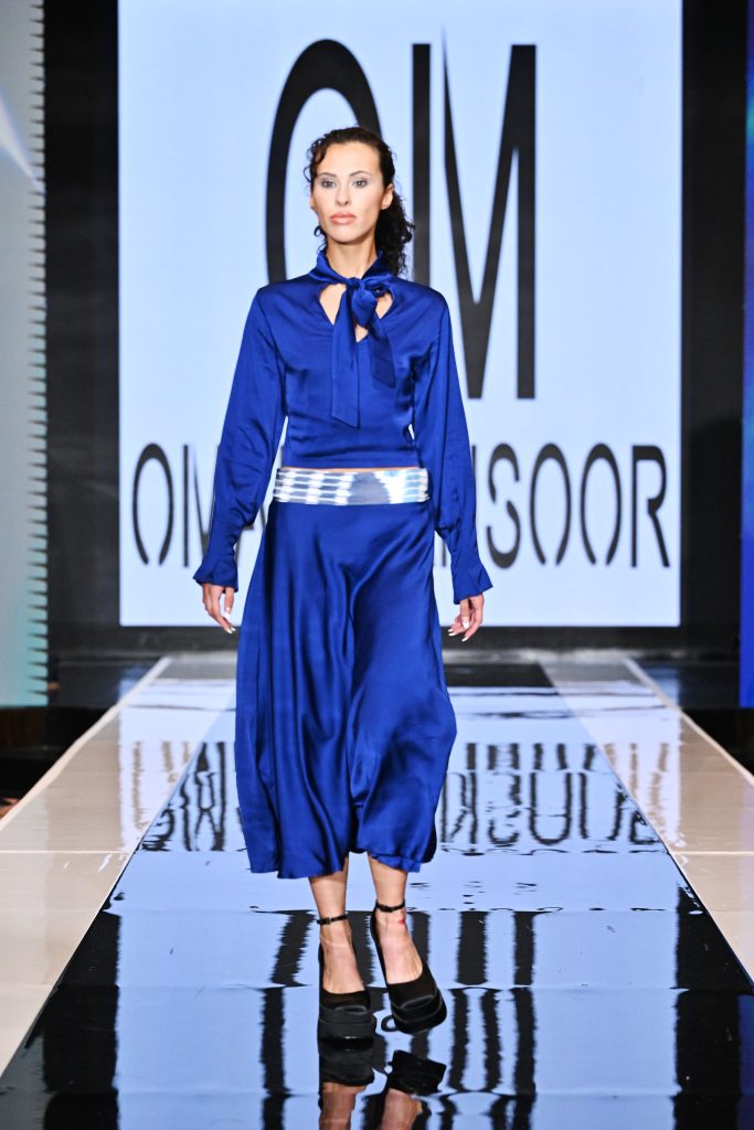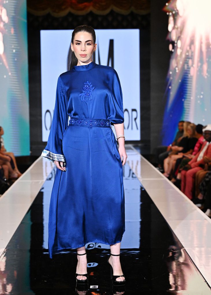 Titled Lapis Lazuli, Mansoor blended old-world glamour with a Gen X edge, showcasing his signature silk creations. The collection featured a range of dresses, from knee-length to full-length, sleeveless to long-sleeved, all adorned with semi-precious stones and detailed Uzbek Ikat trimmings. The mix of luxurious fabrics and intricate embellishments made it clear—his designs speak to a broader audience, offering timeless elegance with a modern twist.